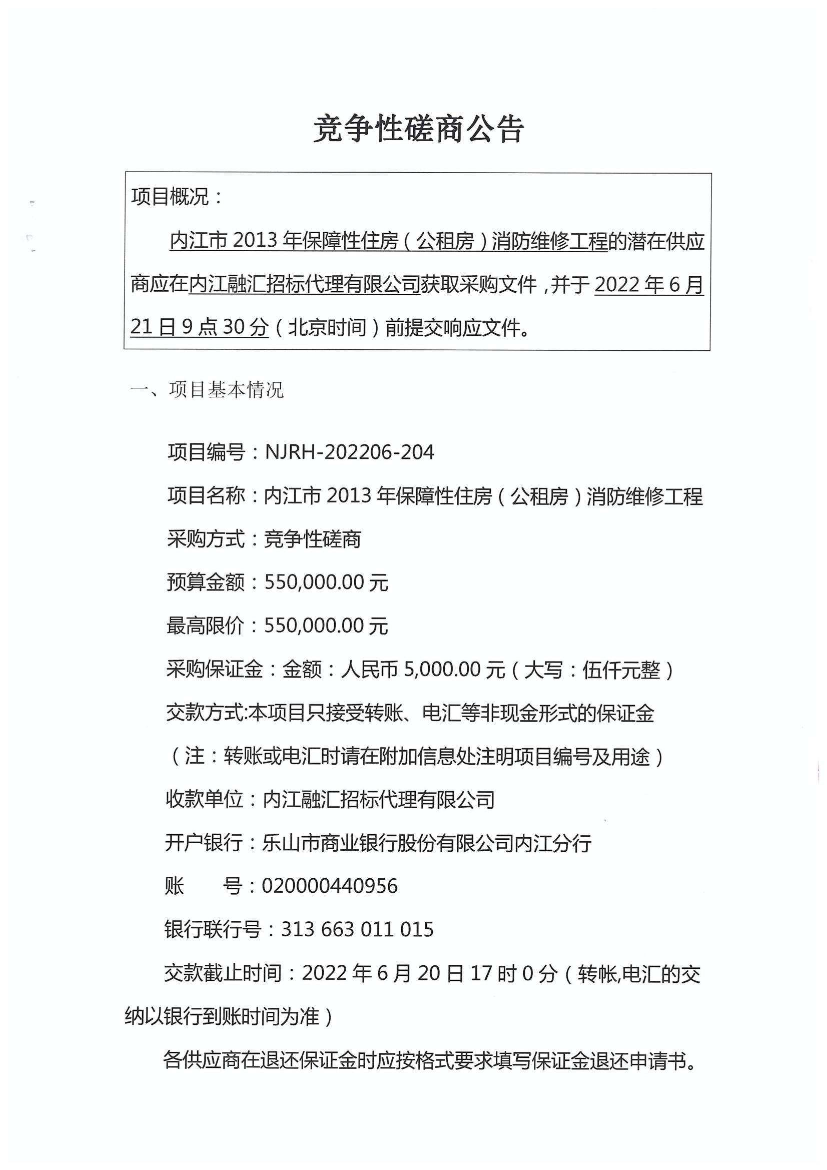 內(nèi)江市2013年保障性住房(公租房)消防維修工程的潛在供應(yīng)商應(yīng)在內(nèi)江融匯招標(biāo)代理有限公司獲取采購(gòu)文件,并于2022年6月21日9點(diǎn)30分(北京時(shí)間)前提交響應(yīng)文件。