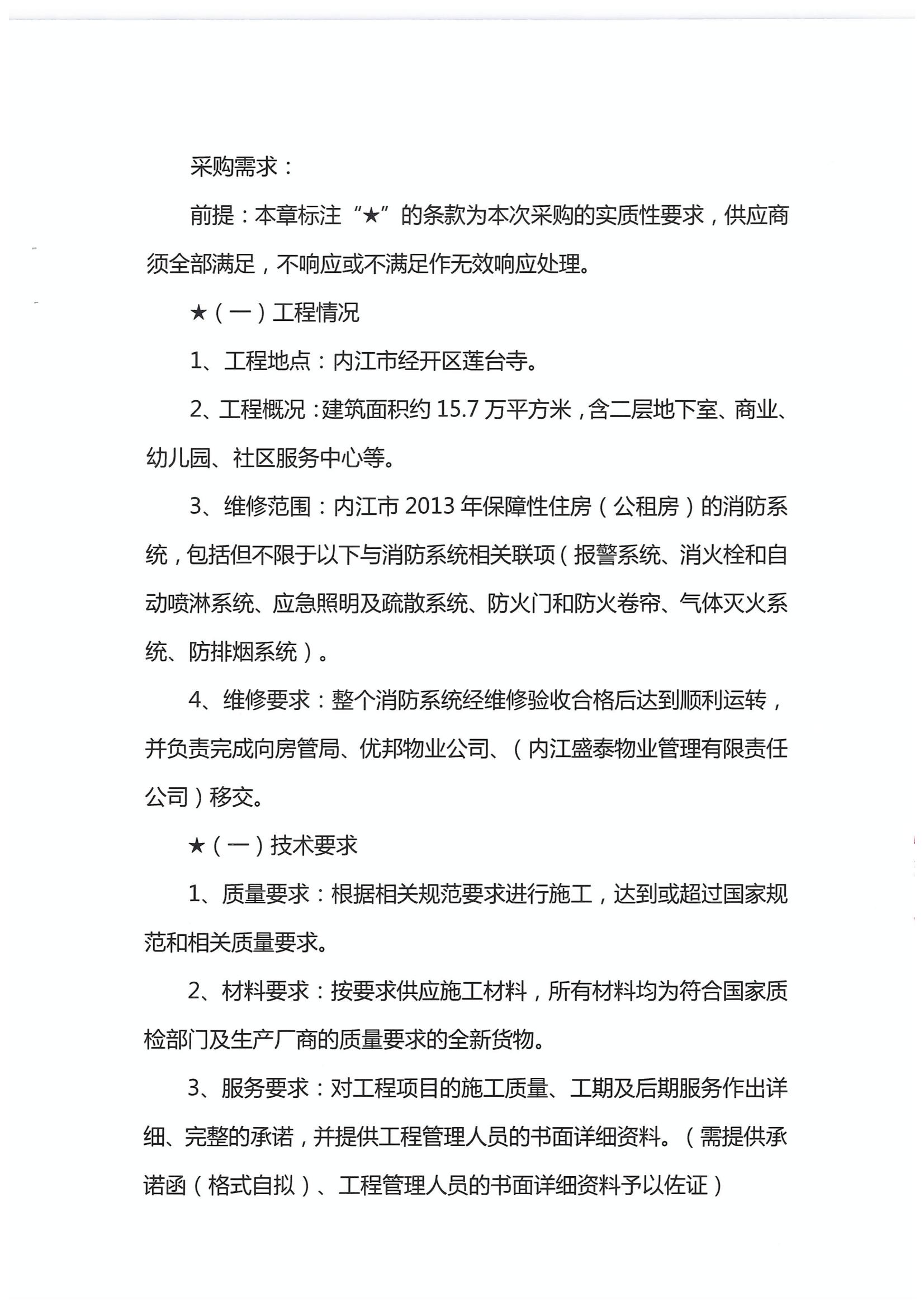 4、維修要求:整個(gè)消防系統(tǒng)經(jīng)維修驗(yàn)收合格后達(dá)到順利運(yùn)轉(zhuǎn),并負(fù)責(zé)完成向房管局、優(yōu)邦物業(yè)公司、(內(nèi)江盛泰物業(yè)管理有限責(zé)任公司)移交。