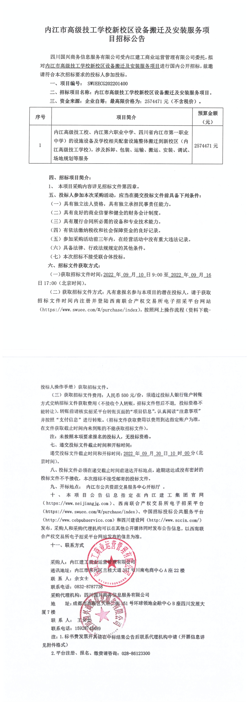 四川國興商務(wù)信息服務(wù)有限公司受內(nèi)江建工商業(yè)運(yùn)營(yíng)管理有限公司委托,擬對(duì)內(nèi)江市高級(jí)技工學(xué)校新校區(qū)設(shè)備搬遷及安裝服務(wù)項(xiàng)目進(jìn)行國內(nèi)公開招標(biāo),茲邀請(qǐng)符合本次招標(biāo)要求的投標(biāo)人參加投標(biāo)。