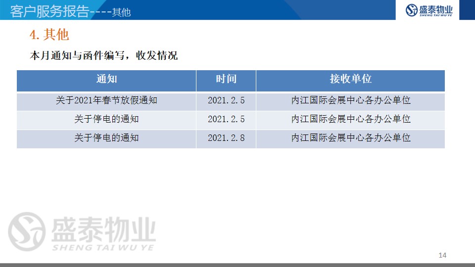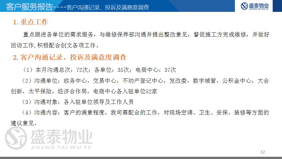 衷心感謝您對會(huì)展中心項(xiàng)目工作的支持與配合!為營造一個(gè)安全、舒適、優(yōu)美、文明的辦公環(huán)境,不斷提高我們的物業(yè)服務(wù)水平,體現(xiàn)“客戶至上、服務(wù)第一”的服務(wù)宗旨,更好地搭建與業(yè)主之間溝通的平臺(tái),現(xiàn)將會(huì)展中心項(xiàng)目2月工作報(bào)告呈現(xiàn)給您,以便您了解、監(jiān)督我們的物業(yè)服務(wù)工作,敬請您提出寶貴的意見。